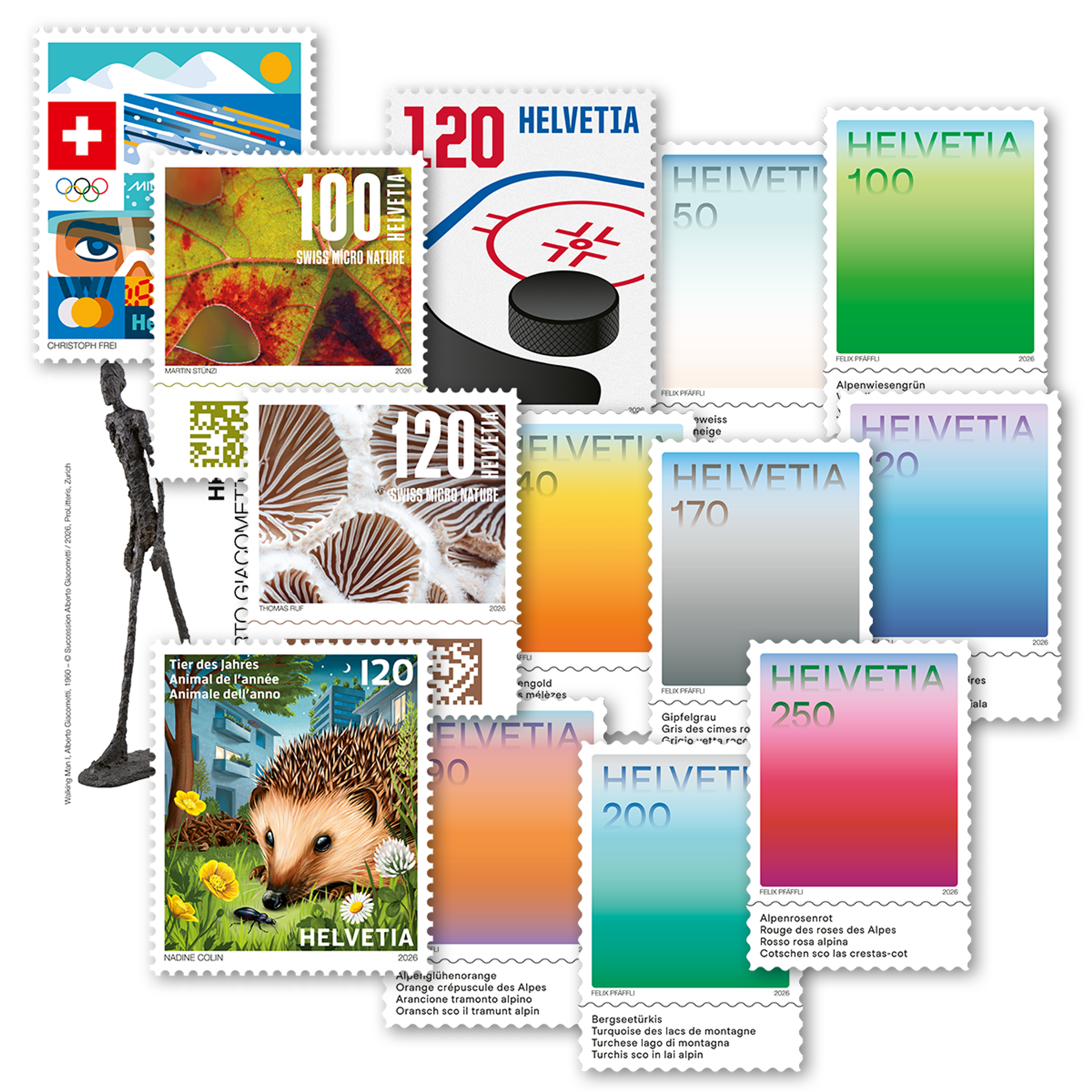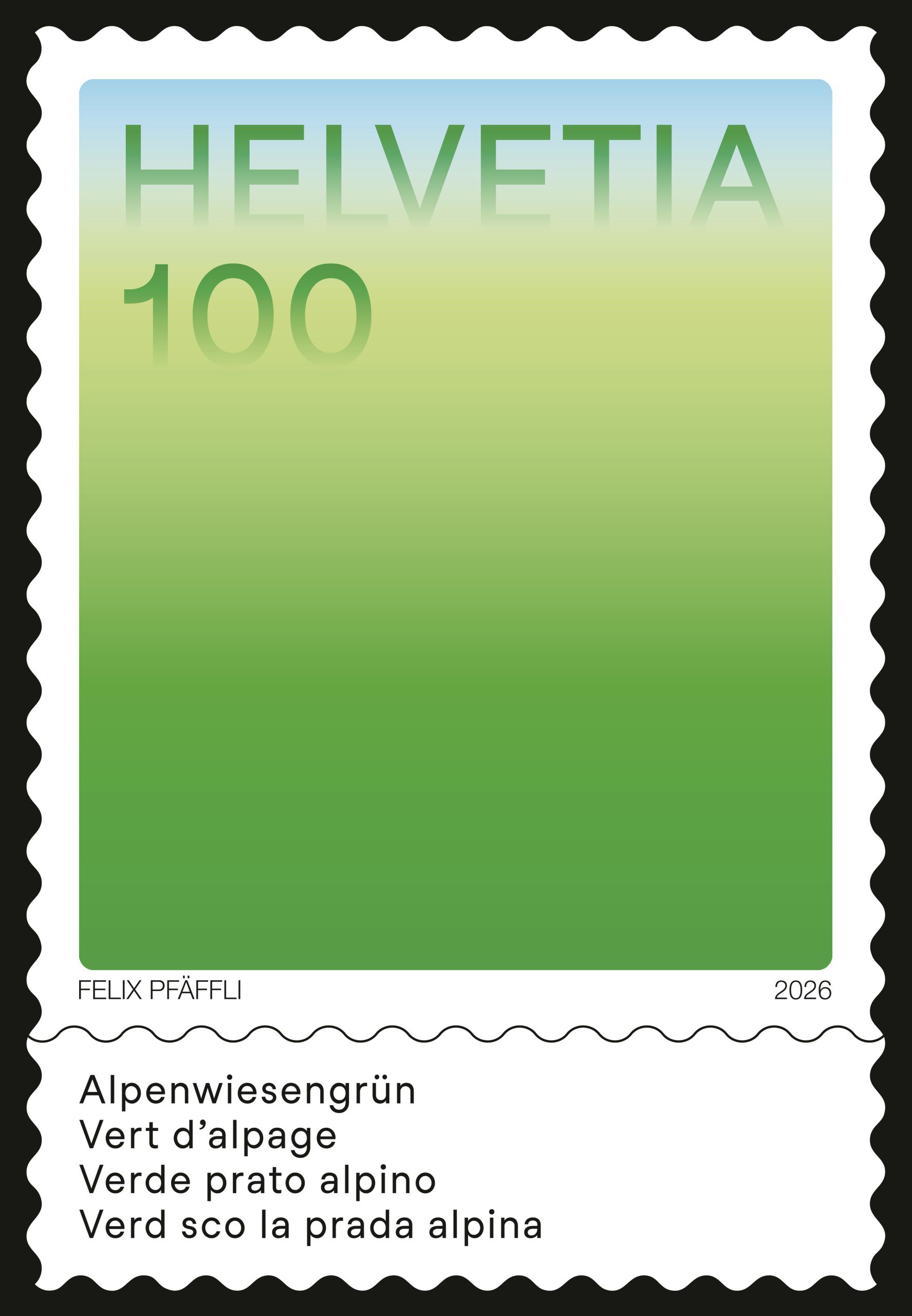Der Luzerner Grafiker Felix Pfäffli, aus der zeitgenössischen Grafikszene nicht wegzudenken, hat eine Serie von acht Briefmarken entworfen, die von den landestypischen Farbstimmungen inspiriert sind. Darunter - Schneeweiss, Alpenwiesengrün, Alpenglühenorange, Bergseetürkis oder Gletscherhöhlenblau.