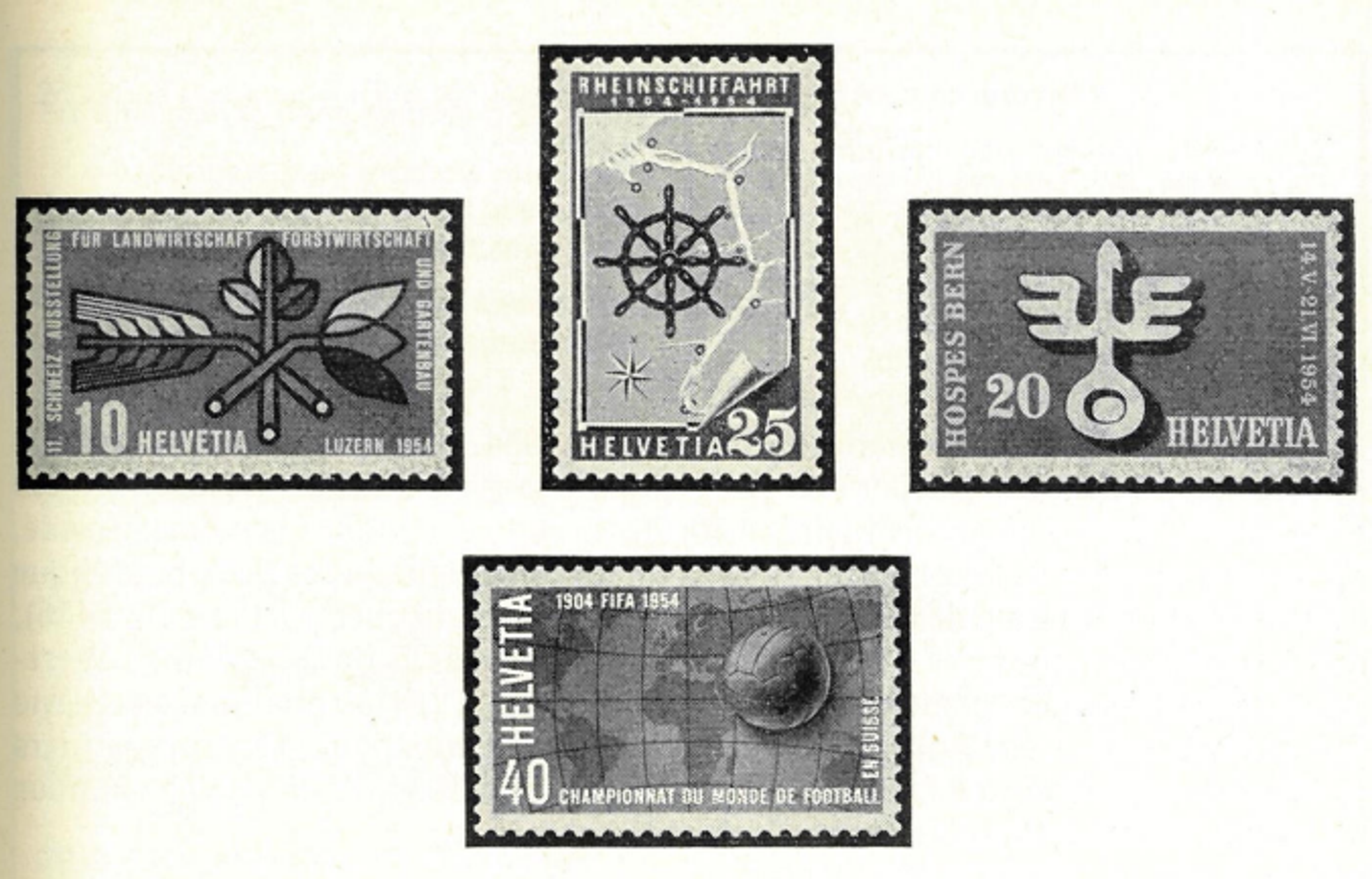 Herausgabe der ersten Sonderbriefmarken. Damals hiessen sie noch «Werbe- und Gedenkmarken». Ein Motiv widmete sich der Rheinschifffahrt, ein anderes der Fussball-Weltmeisterschaft in der Schweiz.