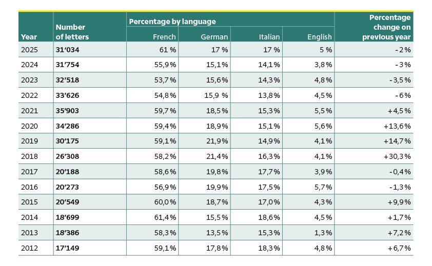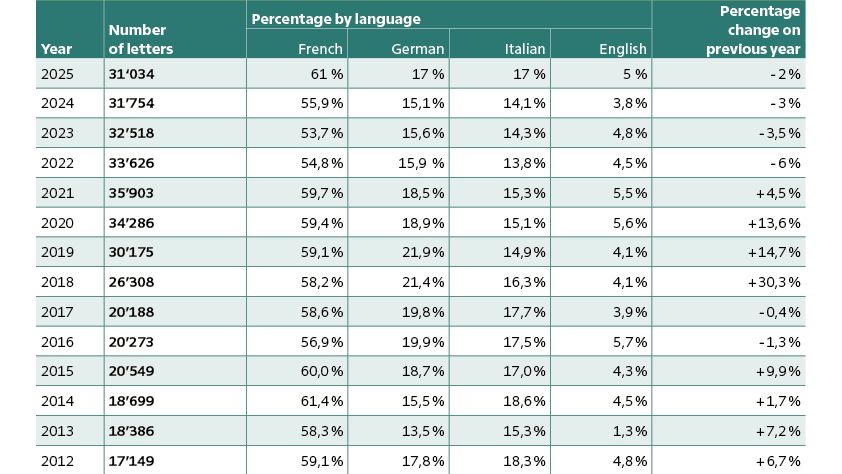 - Stable regional distribution: about 60% of letters come from French-speaking Switzerland, about 20% from German-speaking Switzerland and 20% from Ticino.