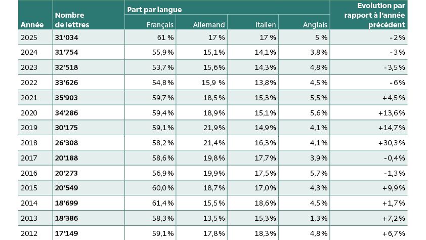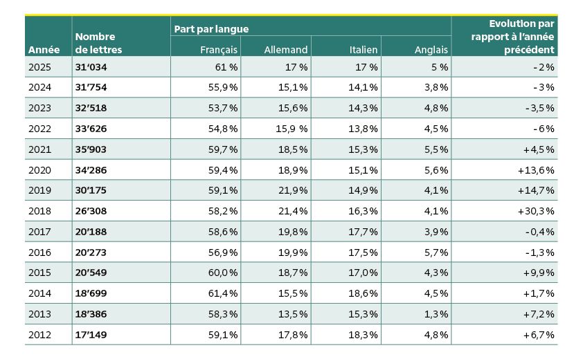 - Légère baisse du volume: le nombre total de lettres a diminué de 2% par rapport à l’année précédente.