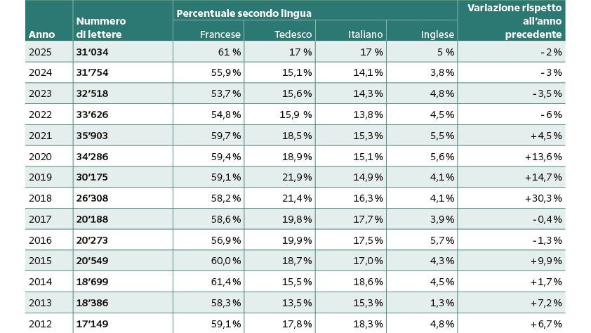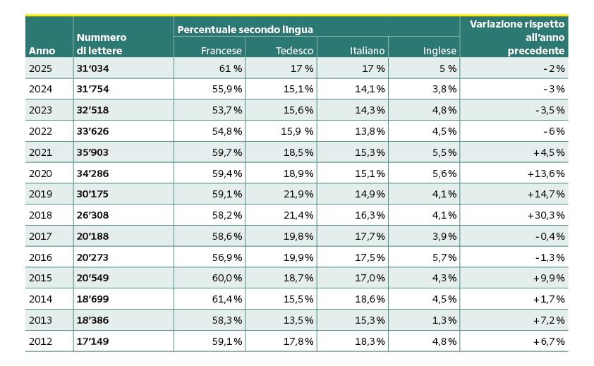 - Ripartizione regionale stabile: circa il 60% delle lettere proviene dalla Svizzera romanda, circa il 20% dalla Svizzera tedesca e circa il 20% dal Ticino.